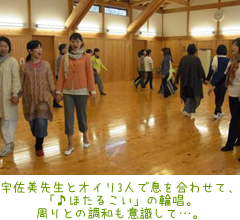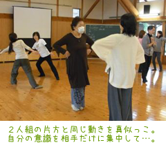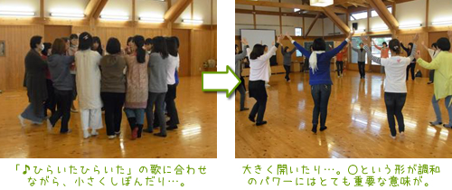 2日目の朝のスタートはみんなで身体を動かしながら、「『テンポ』『リズム』の違い」一定の拍をとったりしながら、それをママの声「メロディー」と肌への皮膚感覚へと繋げていきました。