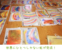 赤・黄・青の3色を、そのときの感覚でそれぞれ選んで色をのせていきます。みんな同じ真っ白な画用紙でも、ひとつも同じ絵はありませんでした。