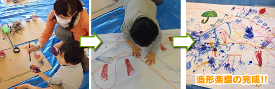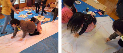 大人も子どもも、自由に描き込んでいきました。そして…「造形楽譜」の完成!!
